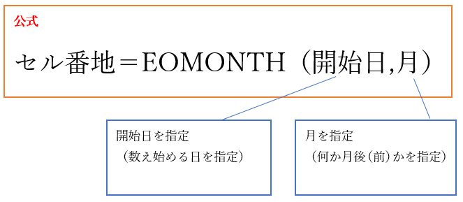 「EOMONTH」は、「End Of MONTH」の略称のため、「エンド・オブ・マンス 関数」と呼びます。数式は、「開始日の日付から、月に入力されている月数後の、月末日」を計算します。