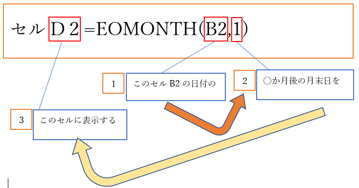 まず、セルD2に、B1の翌月末の日付を算出したいと思います。