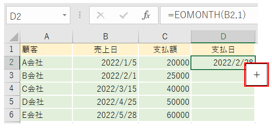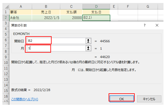 数式「=EOMONTH(B2,1)」を入力します。すると「2022/2/28」の値が返ってきます。