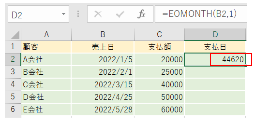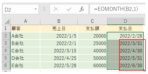 たとえば、売上日の1か月後の月末に支払日としたいなら、EOMONTH関数を利用すると簡単に計算できます。