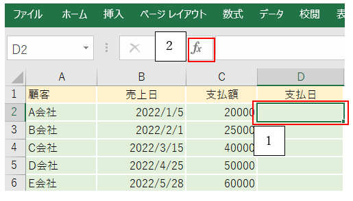‘①セルD2を選択し関数の挿入の「fx」をクリックします。