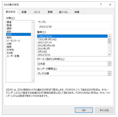 ‘2)「表示形式」タブで、「日付」を選択し、種類で「2012/3/14」など、表示したい表示形式を選ぶことで、先ほどのシリアル値の値を日付形式で表示することができます。