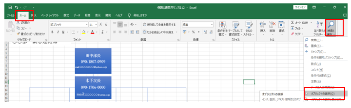 ‘⑤ホームタブ→検索と選択→オブジェクトの選択をクリックして、オブジェクトの選択を解除しておきましょう。