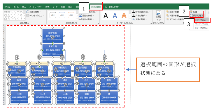 ‘③するとグループ化したい個別の図形が選択状態になります。その後、「図形の書式」タブ→「グループ化」→「グループ化」を選択してください。