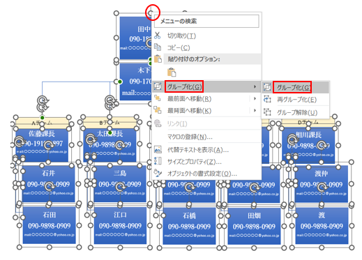 図形の〇マークの上で右クリックして、グループ化→グループ化と選択しても可