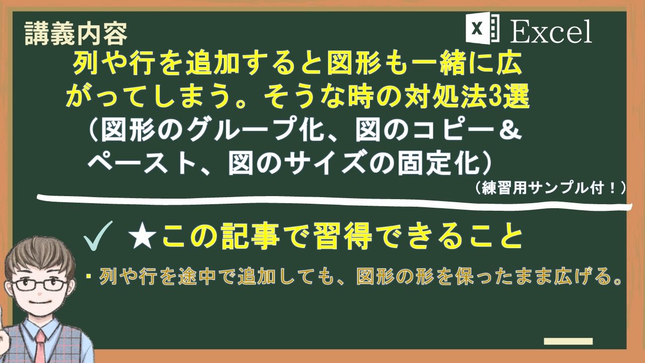 図形をグループ化すると、列や行の追加をしても、図形の形を保つことができます。