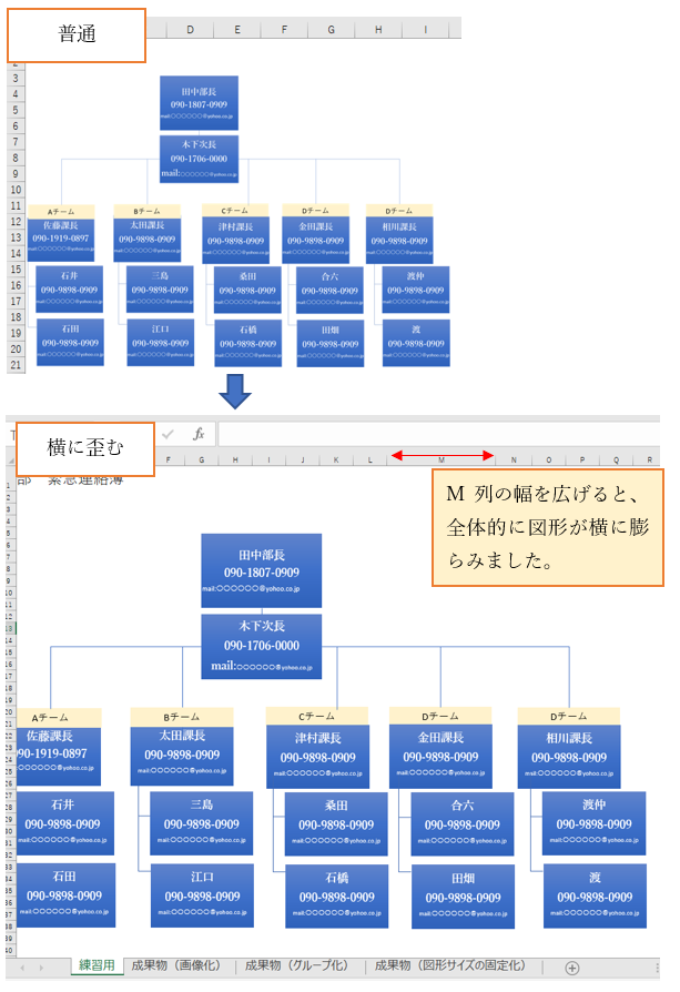 ‘③すると、M列の列幅を広げても、図形サイズは影響を受けなくなりました。