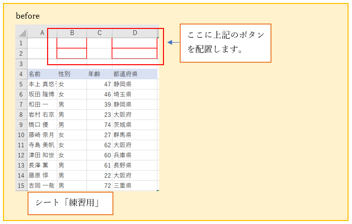 ‘4)セルD2に「練習用(集計へ)」のボタンを作り、クリックすると、シート「練習用(集計へ)」のセルA2を選択するようにします