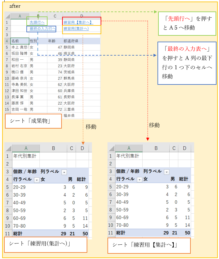 :クリックすると別シートの「練習用(集計へ)」に飛びます。このケースのシート