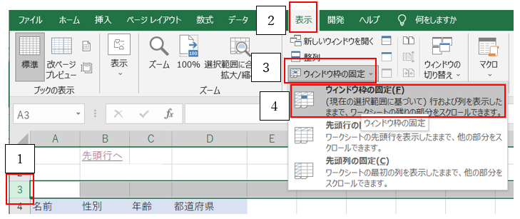 ‘②あと、上の2行はスクロールで動かないようにする為、「ウインドウ枠の固定」を使っています。行番号の「3」をクリックし、「表示」タブ→「ウィンドウ枠の固定」→「ウィンドウ枠の固定」を選択すると固定できます。