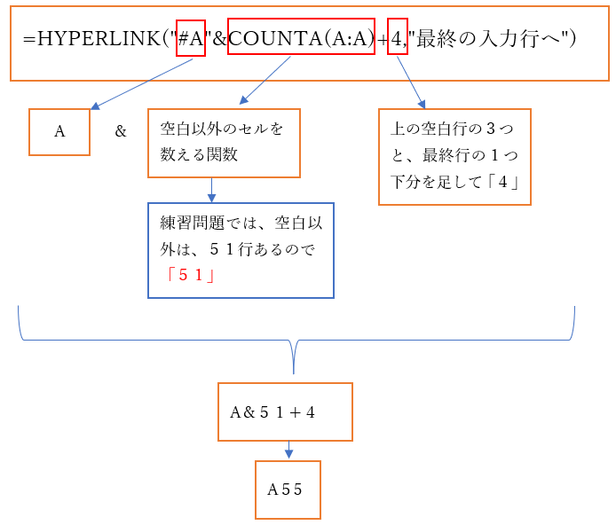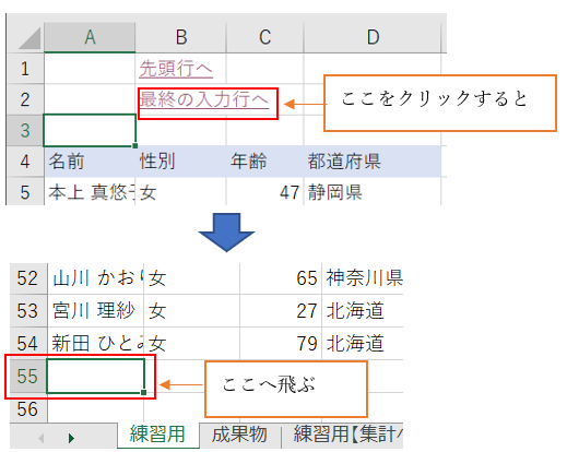 ‘①セルB2に数式「=HYPERLINK(“#A”&COUNTA(A:A)+4,”最終の入力行へ”)」を入力します。セルB2の「最終の入力行へ」をクリックすると、セルA列の最終行の1つ下の空欄、セルA55に飛びます。