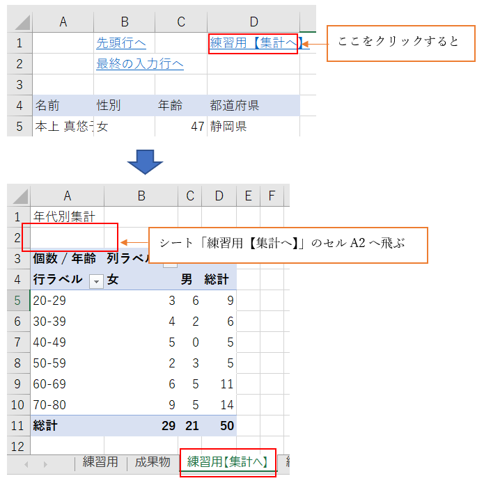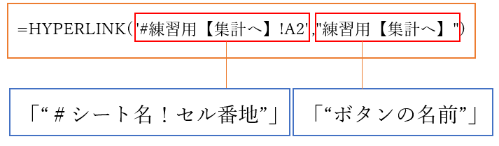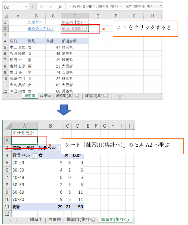 ‘①セルD1に数式「=HYPERLINK(“#練習用【集計へ】!A2″,”練習用【集計へ】”)」を入力します。すると、セルB1の「練習用【集計へ】」をクリックすると、目的のシート「練習用【集計へ】」のセルA2へ飛びます。