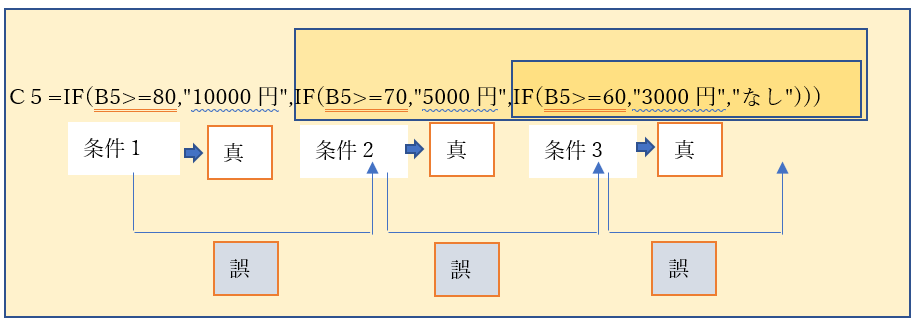 IF関数の複数の条件を左から順番に見ていき、結果に応じて値を返す式です。そのため、