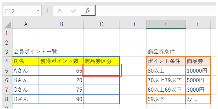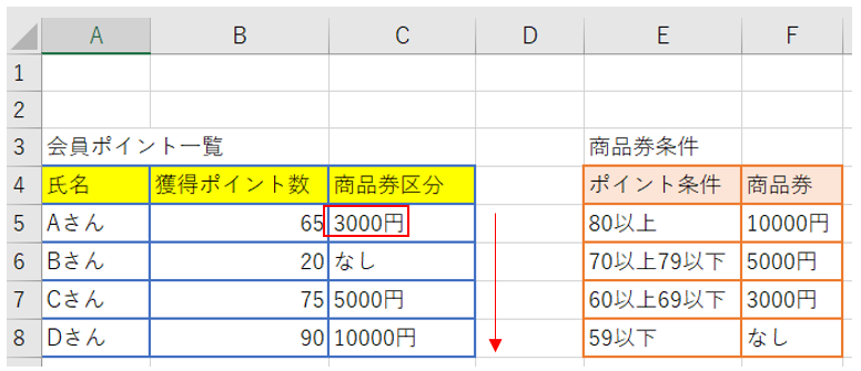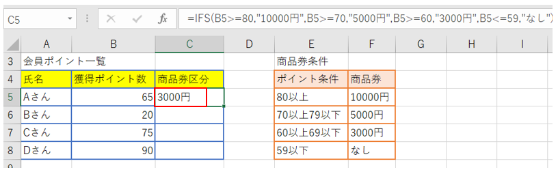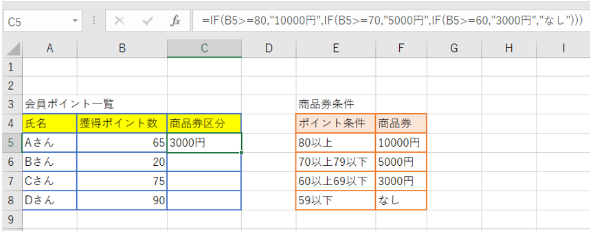Aさんの商品券区分をIF関数で表すと、以下のようになります。