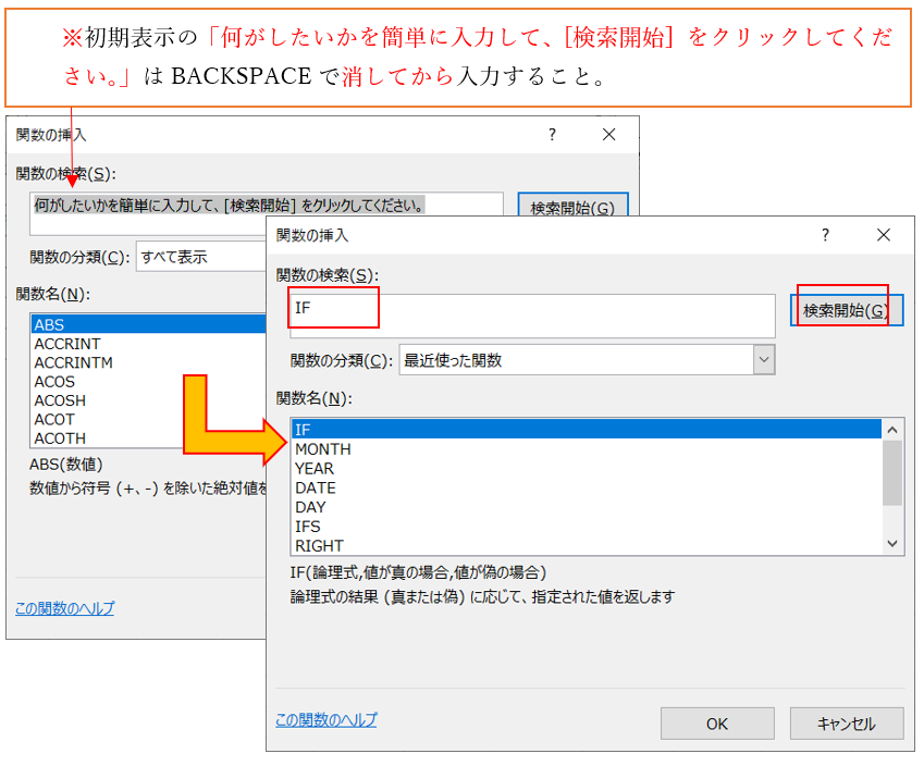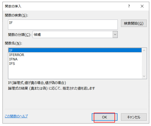 ②「関数の検索」のボックスに半角入力で「IF」と入力し「検索開始」をクリック