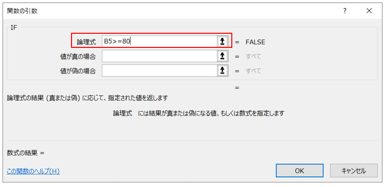 ⑤入力画面の論理式の項目を選択した状態で、セルB5>=80と入力条件1の論理式を入力(Aさんのポイント数が80以上ならば)