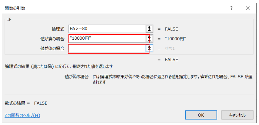 ⑥入力画面の「値が真の場合」の項目をマウスで選択し、10000円と入力、その後、「値が誤りの場合」の入力ボックスをマウスで選択する。