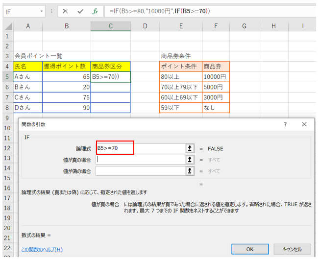 ⑧すると、IF関数のダイアログボックスが表示されます。論理式に条件2式を入力します。B5>=70(Aさんのポイントが70以上であるなら)を入力