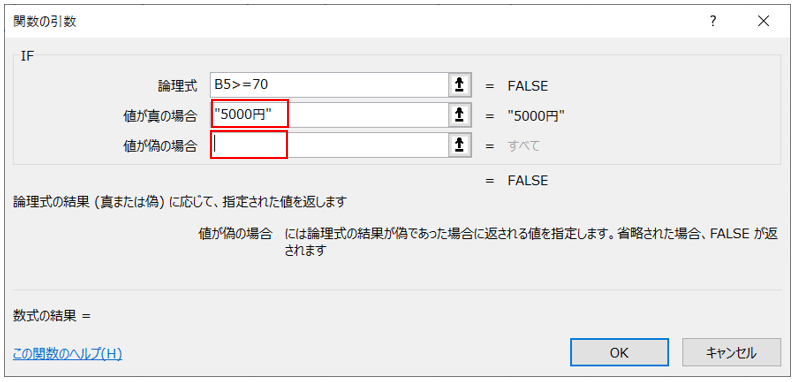 ⑨入力ボックスの「値が真の場合」をマウスで選択し、5000円と入力、その後、「値が誤りの場合」の入力項目をマウスで選択する。