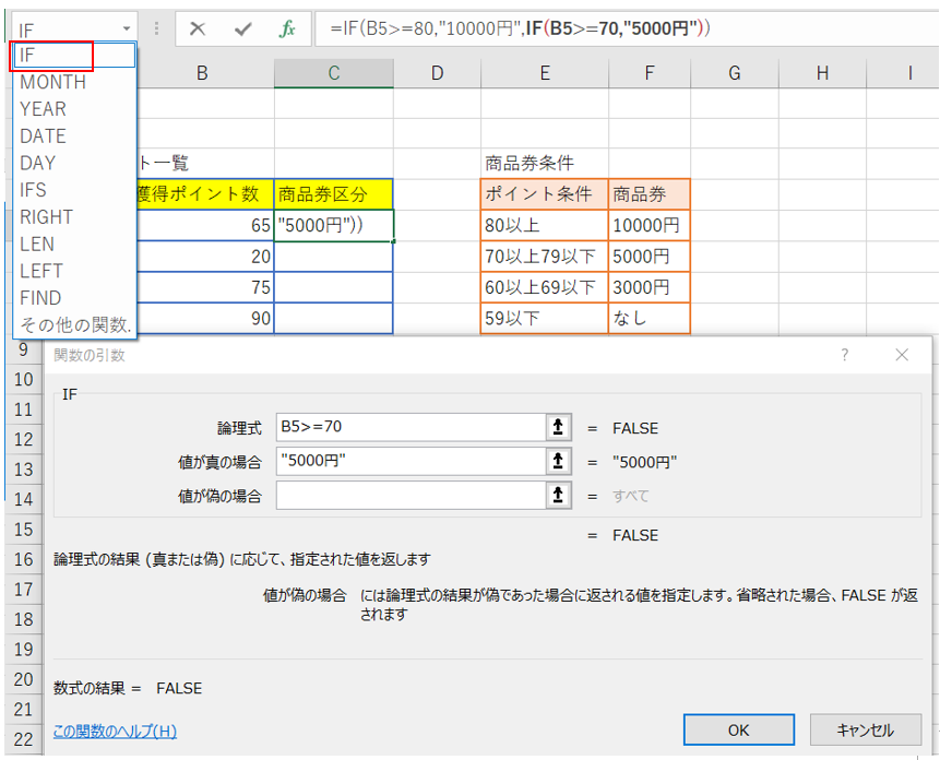 条件2の式は、ポイント70以上なら5000円、誤りなら条件3という式