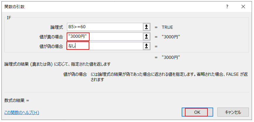 ⑫入力項目の「値が真の場合」をマウスで選択し、3000円と入力、その後、「値が誤りの場合」の入力項目に「なし」と入力しOKクリック
