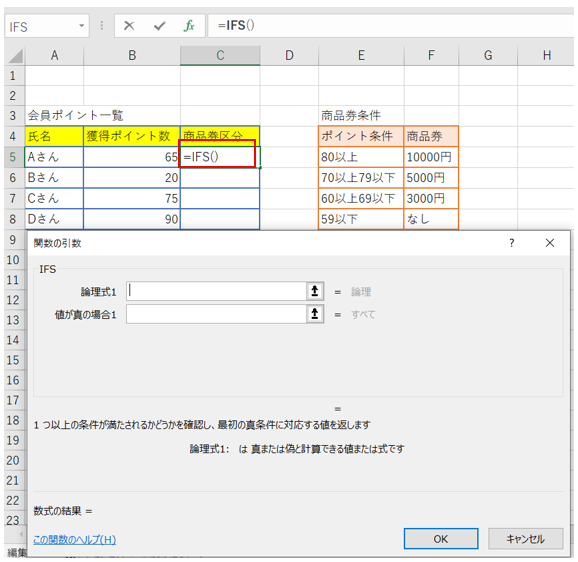 ①まず、セルC5を選択して、IFS関数のダイアログボックスを起動して下さい。