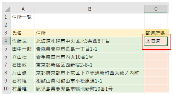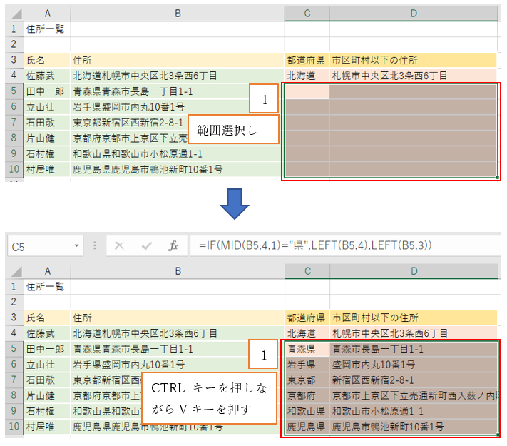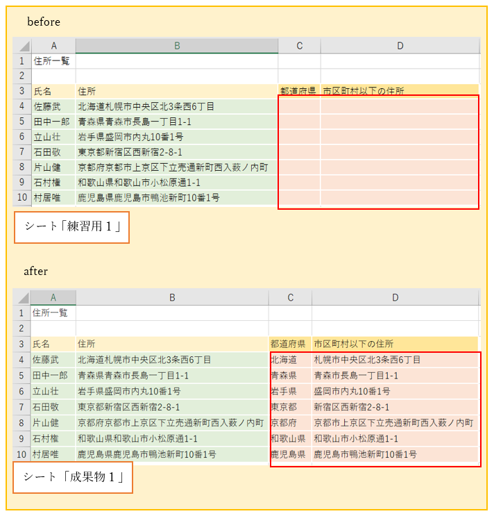 例題は、B列の住所情報をもとに、C列に都道府県、D列に市区町村以下の住所を表示させる問題です。