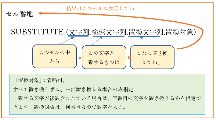 文字列内(セル内)で、検索文字列を探して、置換文字列に置き換える関数です。