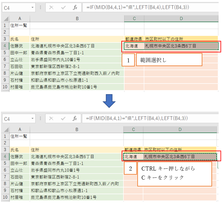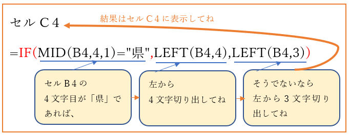 ‘①セルC4を選択し数式「=IF(MID(B4,4,1)=”県”,LEFT(B4,4),LEFT(B4,3))」を入力