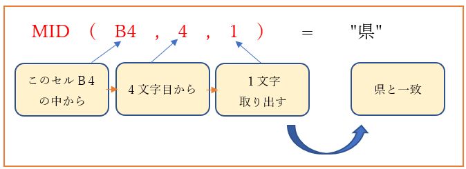 住所の4文字目が県なら、住所の左から4文字分を切り出し、それ以外は、3文字切り出すという処理を、IF関数とMID関数とLEFT関数を使って抽出します。