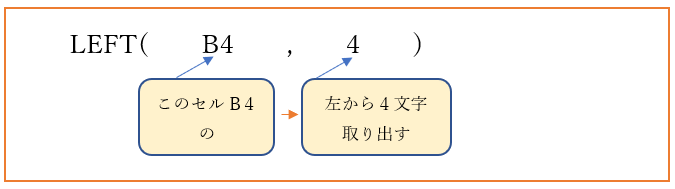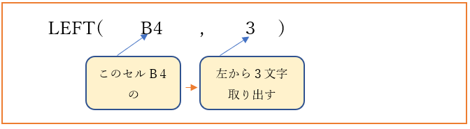 指定したセルの左から数えて〇文字切り出して表示したい時に使う関数です。
