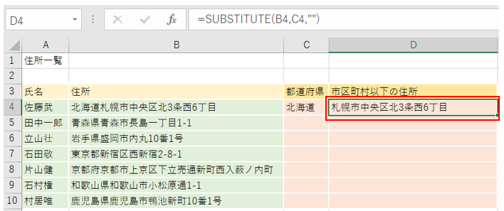 「住所」の中にある「都道府県」を空白に置き換えることで、都道府県以外の下位住所をセルに表示することができます。