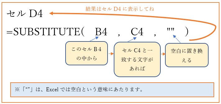 ‘①セルC4を選択し数式「=SUBSTITUTE(B4,C4,””)」を入力してください。すると、