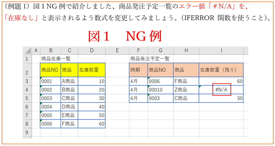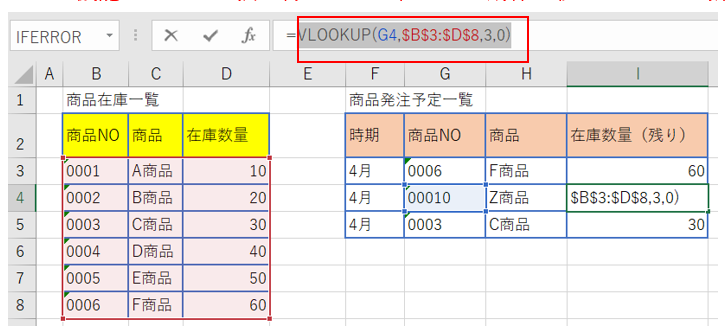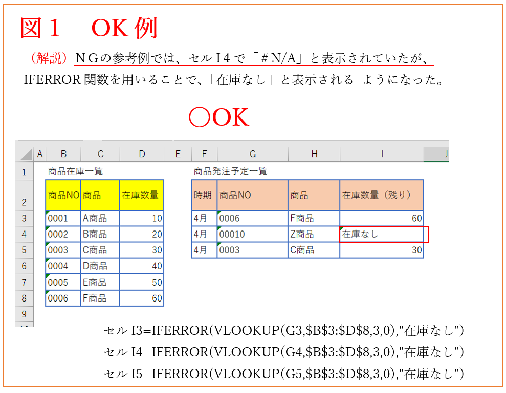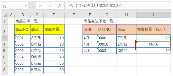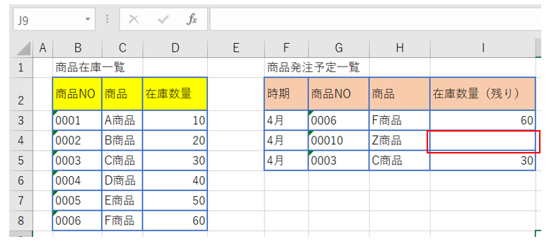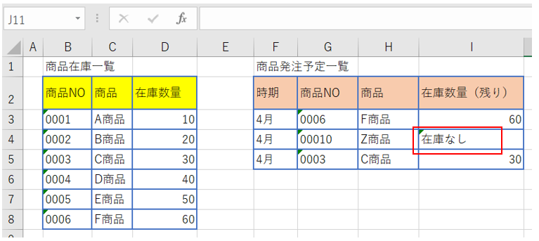商品発注予定一覧のF商品の在庫数量(セルI4)に「在庫なし」と表示されるようにします。