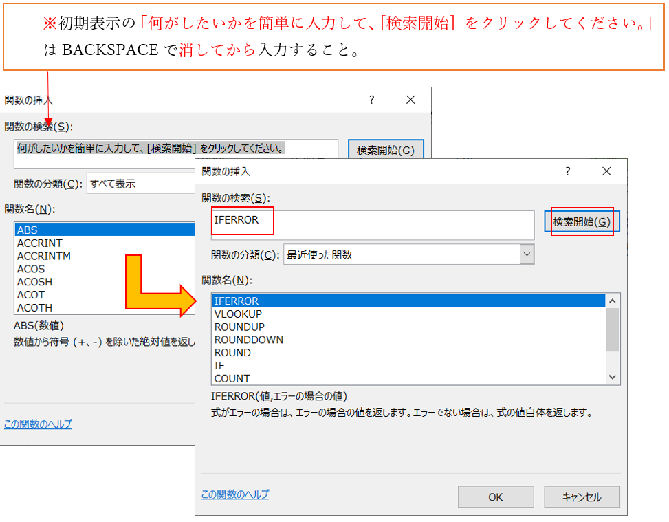 ②関数の検索のテキストボックスに半角入力で「IFERROR」と入力し「検索開始」をクリック
