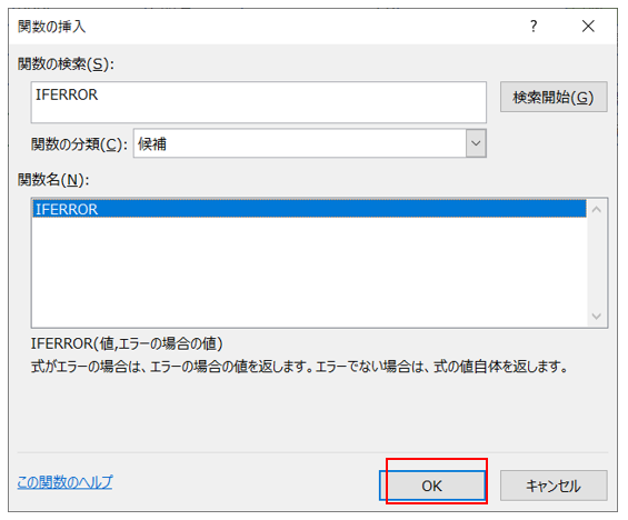 ③関数名にIFERRORが表示されることを確認しOKクリック