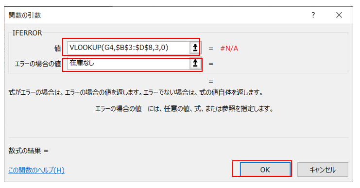 ⑤関数の入力画面の「値」の項目を選択し、Ctrl+Vキーを押す(②でコピーした数式を貼り付け)次にエラーの場合の値を選択し、「在庫なし」と入力しOKをクリック