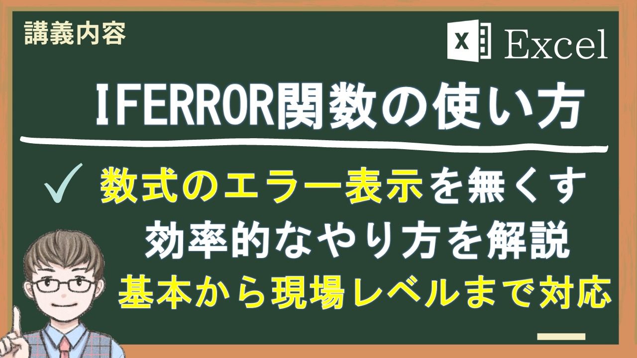 「=IFERROR(計算式,エラーの場合の値)」という数式です。先に、計算式を作成しておいて、後でIFERROR関数に当てはめるやり方が簡単です。昔はISERROR関数とIF関数を組み合わせてエラー表示を見せないようにしていましたが、今は、IFERROR関数の登場によって効率的にエラー回避できるようになりました。