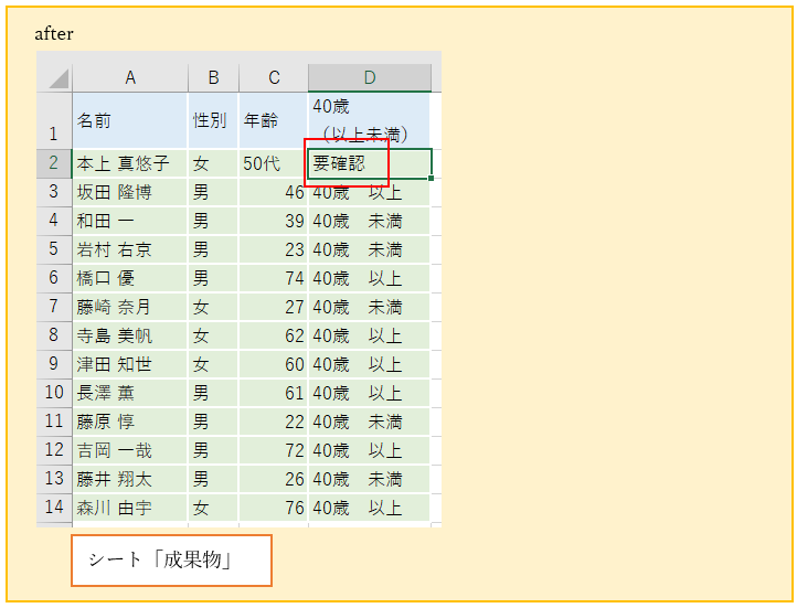 (D列には、あらかじめC列が40歳以上か40歳未満かを判別する数式が入っています。