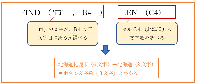 ‘2)市の文字数をLEN、FIND関数を使って調べます。