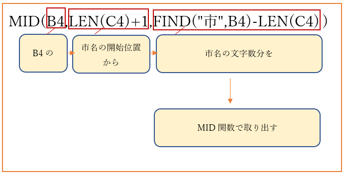 MID関数で、市名の開始位置から、市名の文字数分取り出して、市名を表示させます。