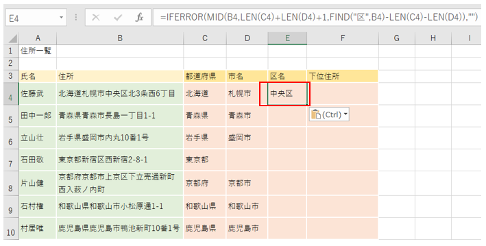 数式「=IFERROR(MID(B4,LEN(C4)+LEN(D4)+1,FIND(“区”,B4)-LEN(C4)-LEN(D4)),””)」を入力してください。すると、中央区が表示されます。