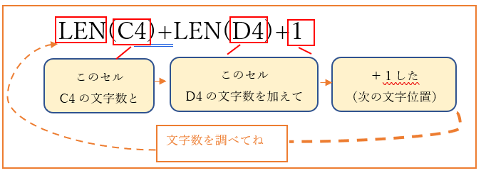 ‘1)区の文字の開始位置を、LEN関数を用いて調べます。