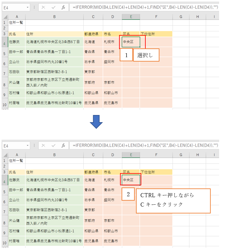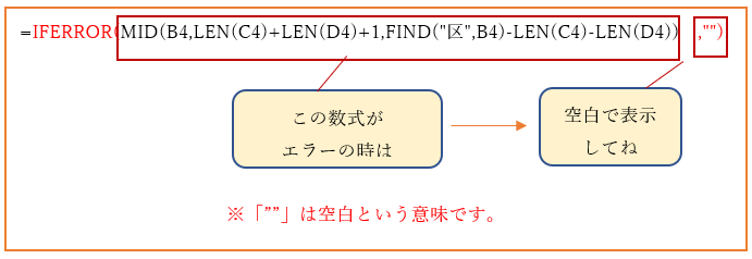 「区名」がない場合は、エラー表示となるので、MID関数の数式をIFERROR関数の中に入れ、「区名」がない時は空白表示させましょう。