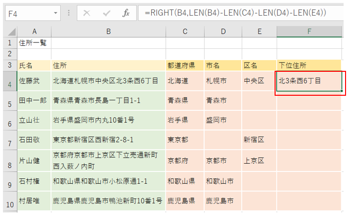 ここでは、下位住所の文字数分を右から取り出す計算をしています。