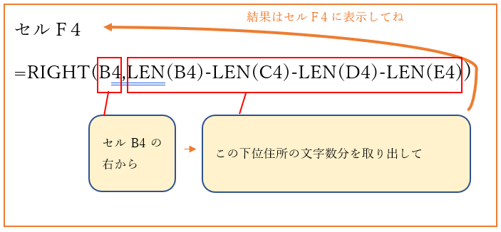 数式「=RIGHT(B4,LEN(B4)-LEN(C4)-LEN(D4)-LEN(E4))」を入力してください。