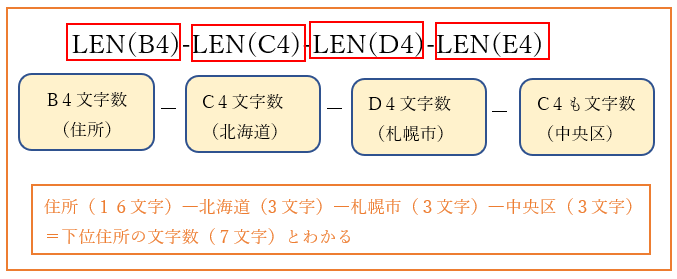 ‘1)市の文字の開始位置を、LEN関数を用いて調べます。
