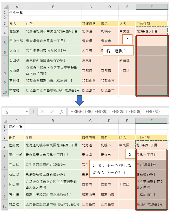‘2)下位住所を、RIGHT関数を使って取り出します。