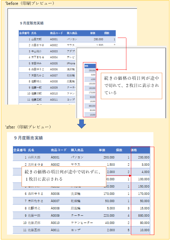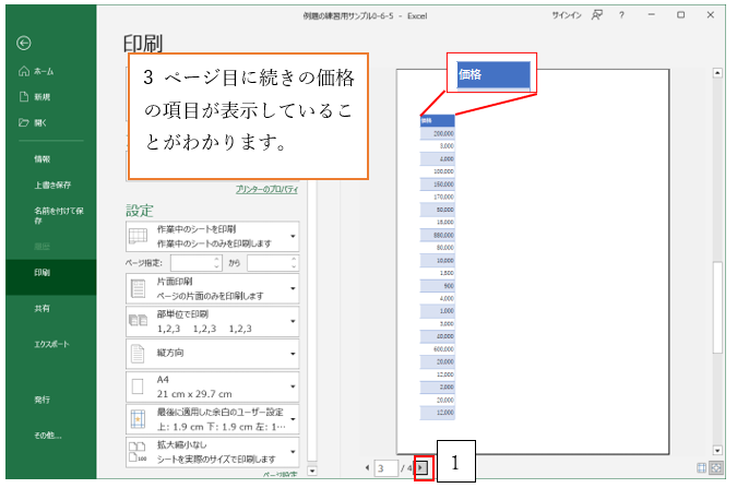 ‘⑩印刷プレビューを確認すると、1ページ目に「価格」の項目が収まっていることがわかります。