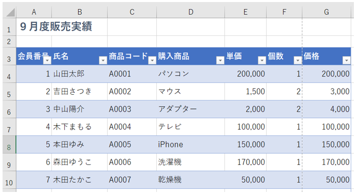 練習サンプルデータは、ダウンロードファイルのシート「練習用」となります。